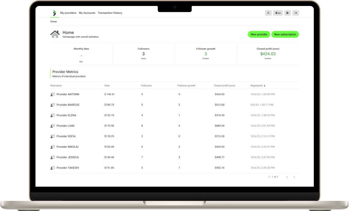 Quản lý tất cả các giao dịch sao chép ở một nơi. Theo dõi đăng ký, lợi nhuận và phí bằng các bộ lọc và hành động nhanh chóng.